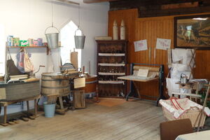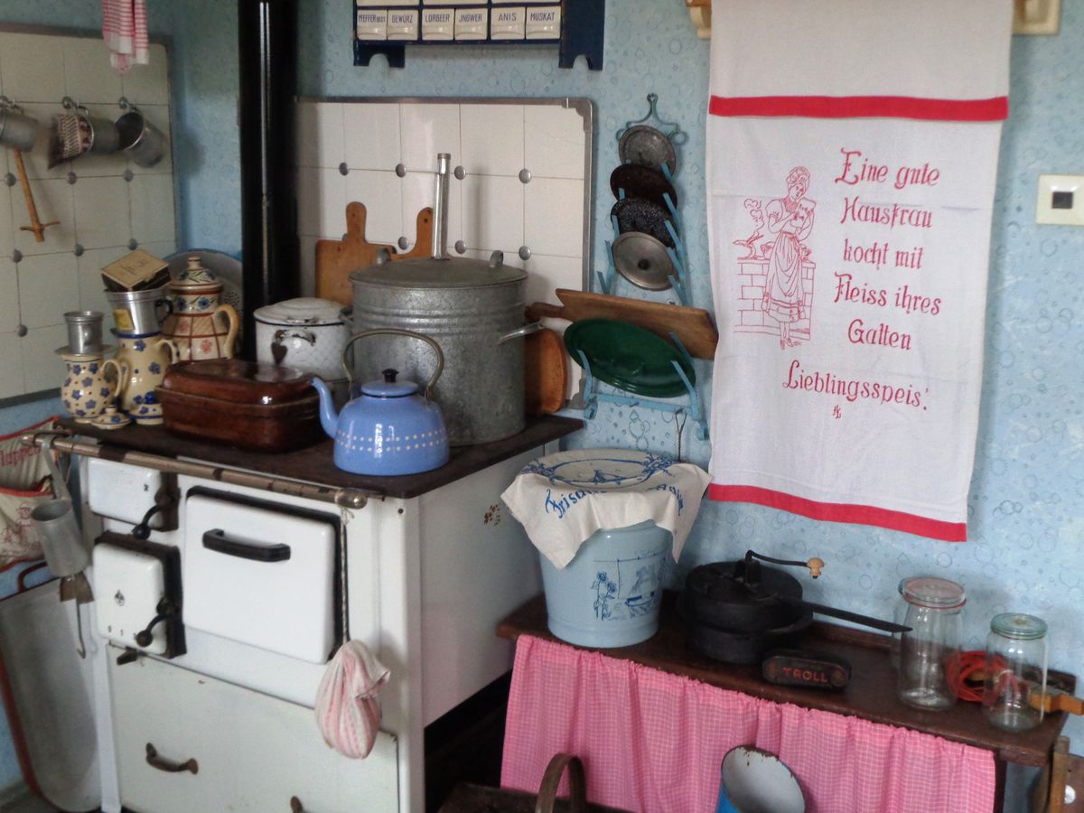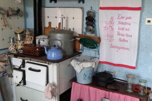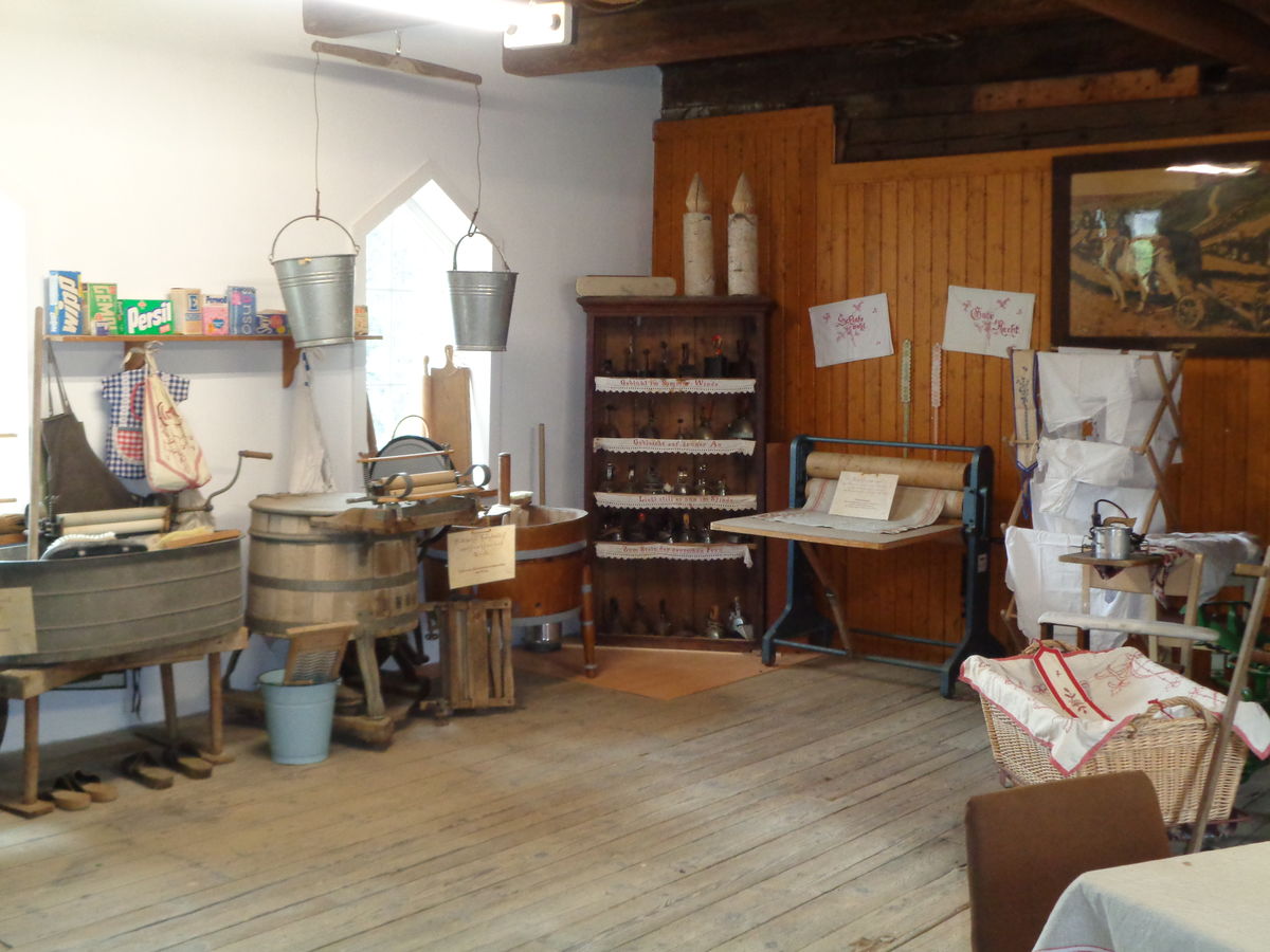 Im ehemaligen Wohnhaus können einige historisch eingerichtete Räume (Küche, Wohnstube, Schlafzimmer, Klassenzimmer),