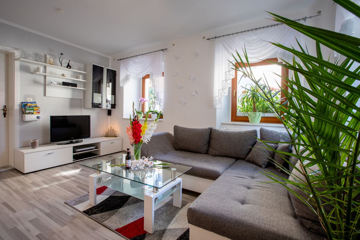 - Wohnstube mit TV, Couch kann in eine weitere Schlafgelegenheit umgewandelt werden